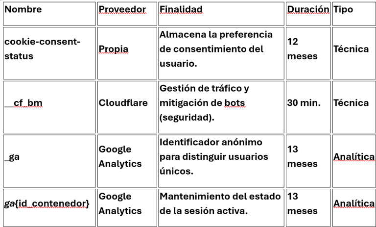 Garantizan el funcionamiento correcto del Sitio Web y la seguridad del mismo (como la gestión de tráfico y preferencias de configuración). Según el artículo 22.2 de la LSSI, estas cookies no requieren el consentimiento del usuario.